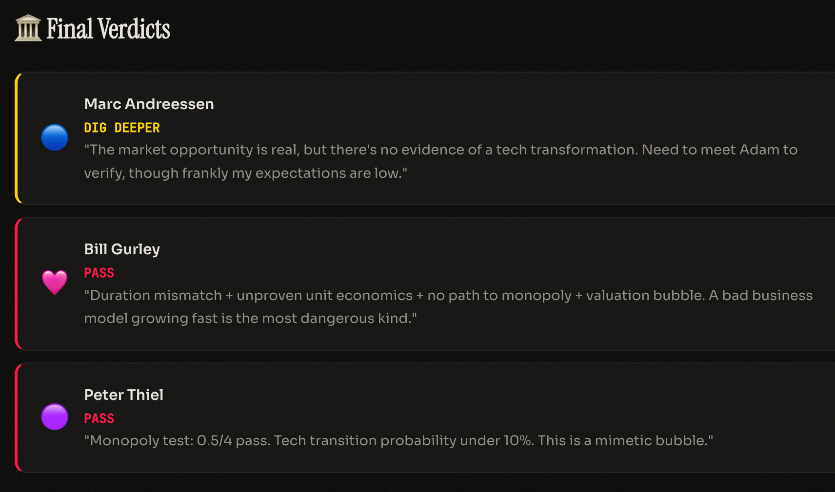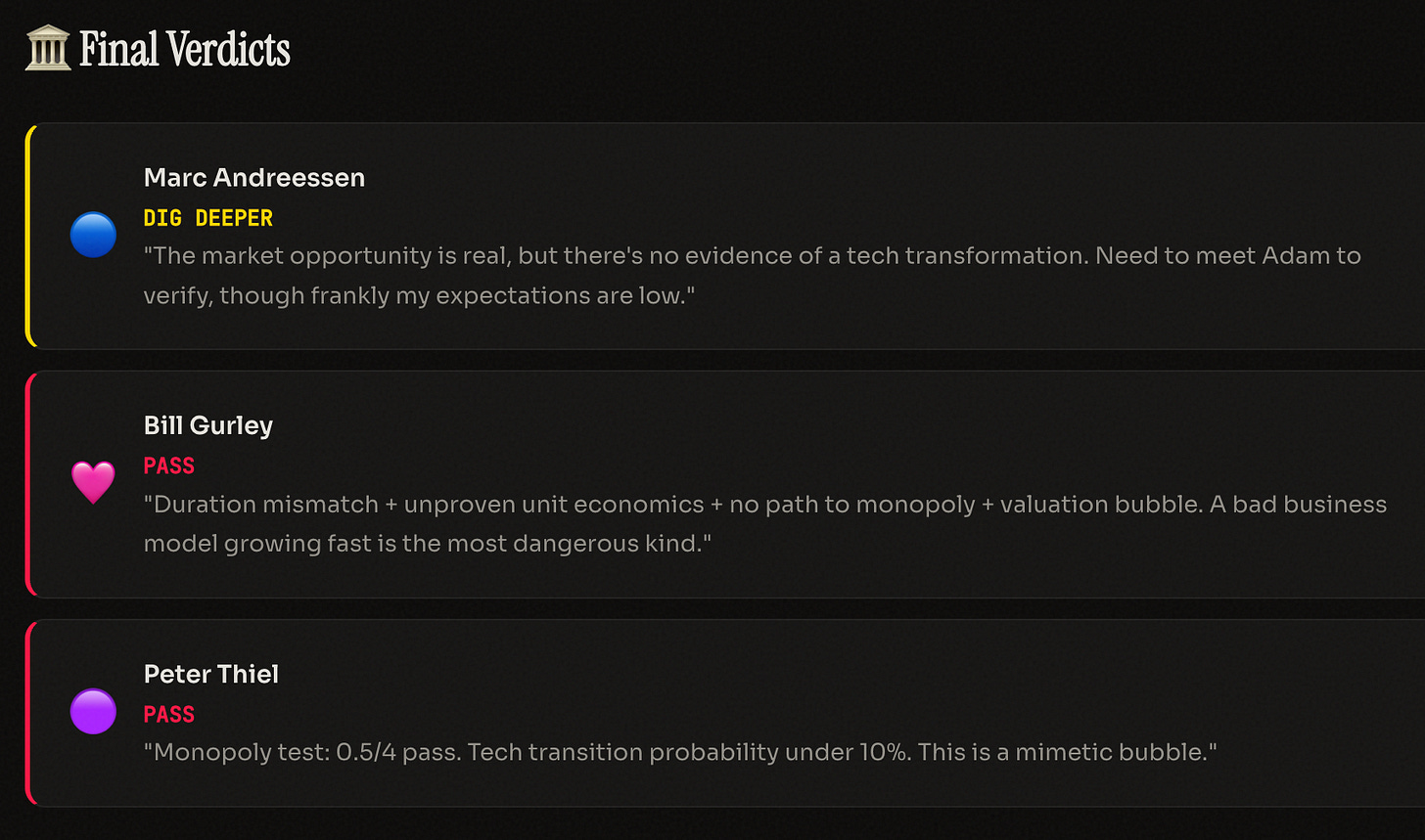 Then I ran WeWork’s 2012 deck. 3 out of 10 voted Pass. The AI raised red flags. In reality? Masa Son committed $4.4 billion after a 12-minute meeting. (Maybe I should add Masa to the persona list and re-run it... )