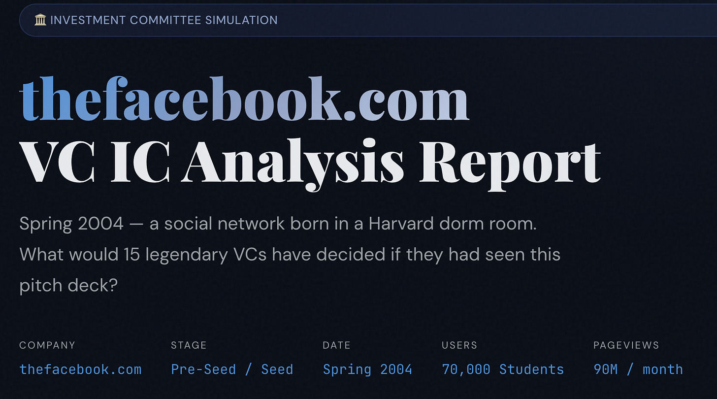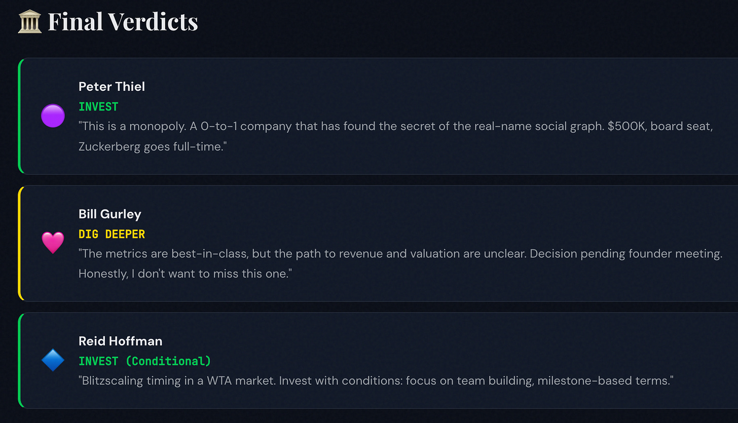 I fed it thefacebook’s 2004 pitch deck. 9 out of 10 voted Invest. Zero passes. Near-unanimous. And yes, AI-Peter Thiel made the same call real Peter Thiel did.